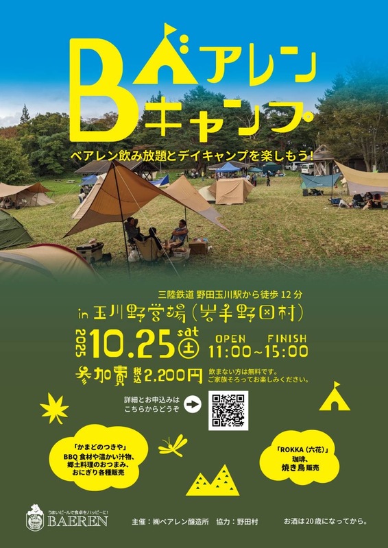キャンプ場でベアレンビール最大4時間飲み放題! 村内飲食店やカフェによるフードコーナーもありますので、デイキャンプを楽しみながらクラフ... 続きを読む