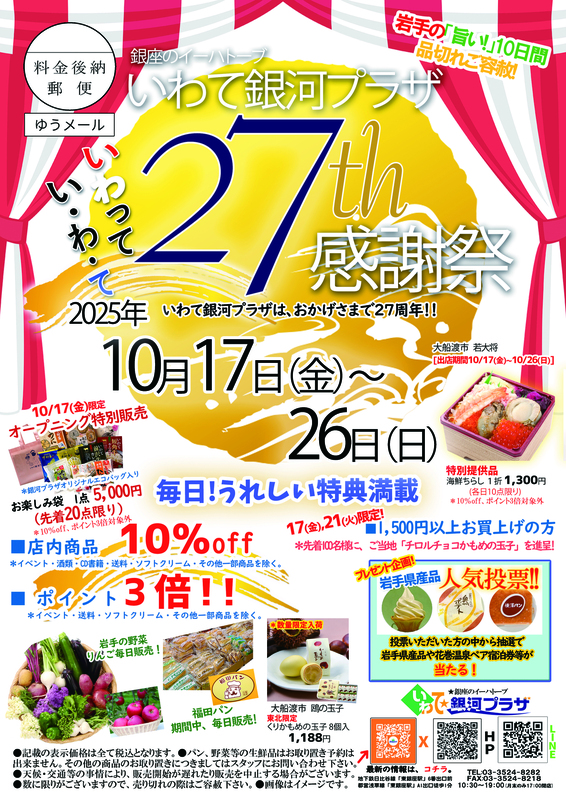 いわて銀河プラザは、おかげさまで27周年を迎えます! 感謝祭期間中は、大船渡「若大将」の海鮮ちらしを各日10点限りで特別提供! 岩手... 続きを読む