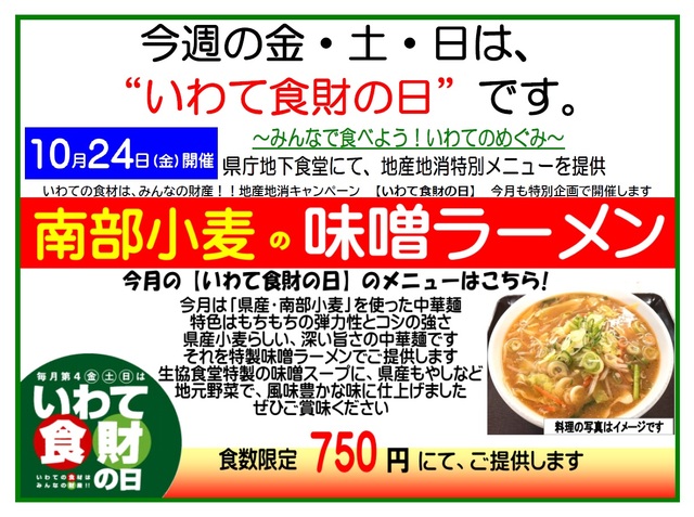 毎月第4土曜日をはさんだ金曜日・土曜日・日曜日の「いわて食財の日」に合わせ、県庁生協の食堂において、地産地消の特別メニューを提供しています... 続きを読む