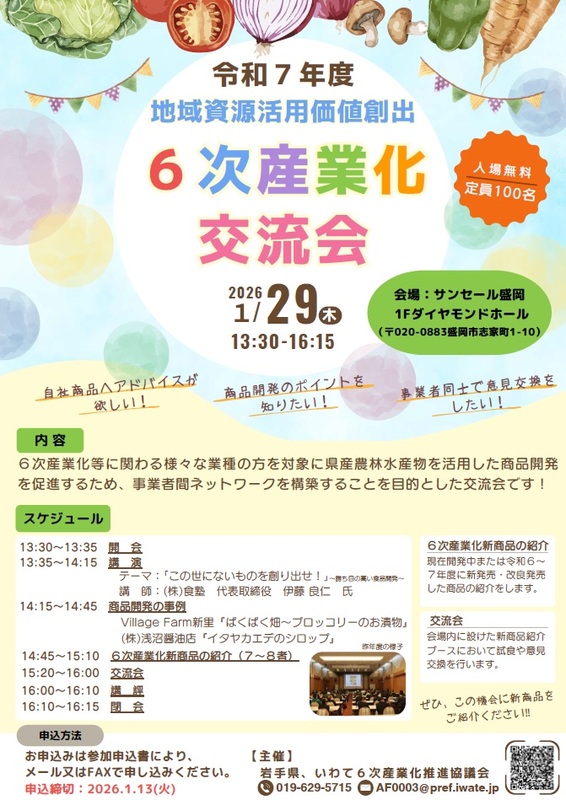 6次産業化等に関わる様々な業種の方を対象に、県産農林水産物を活用した商品開発を促進するため、事業者間ネットワークを構築することを目的とした... 続きを読む