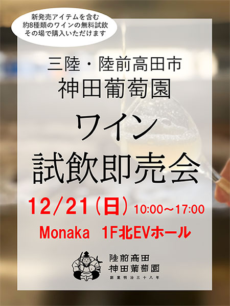 陸前高田市の神田葡萄園による、ワインの試飲即売会が開催されます! 新発売アイテムを含む約8種類のワインが無料試飲でき、その場で購入でき... 続きを読む