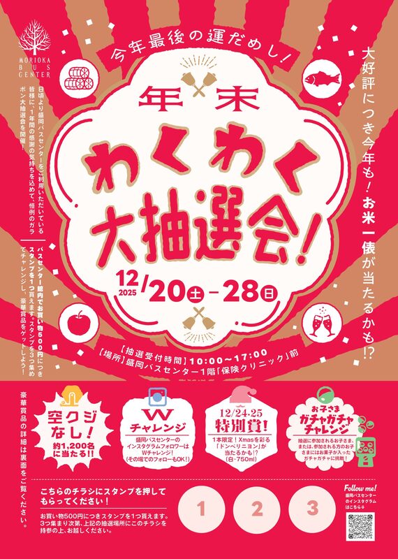 今年最後の運試し!盛岡バスセンターにて、毎年恒例「年末わくわく大抽選会」が開催されます! 館内でお買い物500円ごとにもらえるスタンプ... 続きを読む