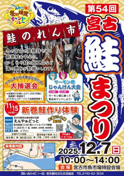 冬の宮古の風物詩「新巻鮭」を中心に、いくらや鮭の加工品など、海の恵みが勢揃い! 「鮭」にまつわる豪華景品が当たる大抽選会や、サーモン君... 続きを読む