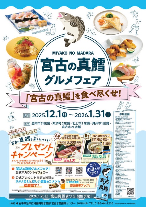 全国有数の水揚げ量と高鮮度を誇る「宮古の真鱈」。 12月と1月の2か月間、宮古市・盛岡市等の飲食店・鮮魚店等57店舗にて、この「宮古の... 続きを読む