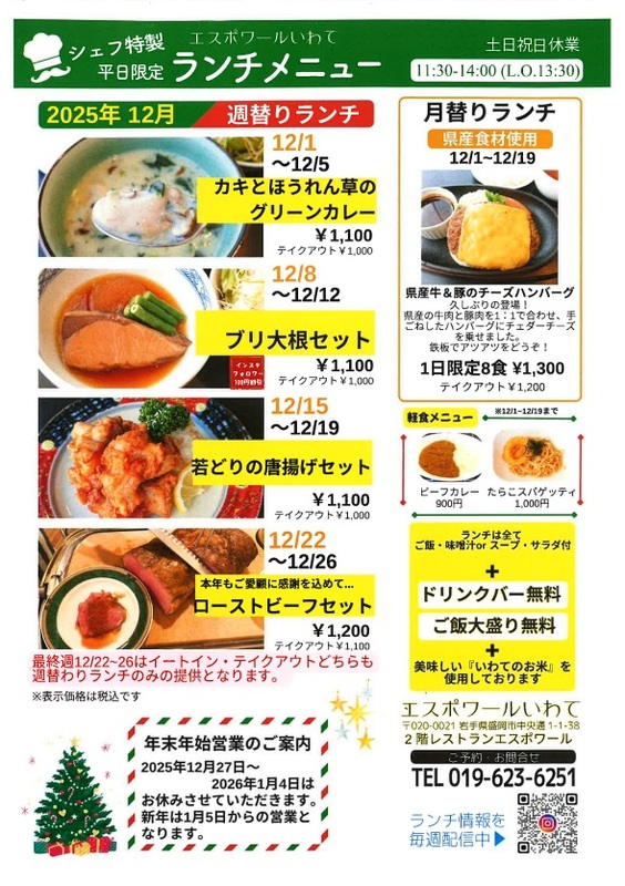 エスポワールいわてのレストランエスポワールでは、月替りの「いわて県産食材ランチ」が提供されています。 12月は「県産牛&豚のチーズハン... 続きを読む