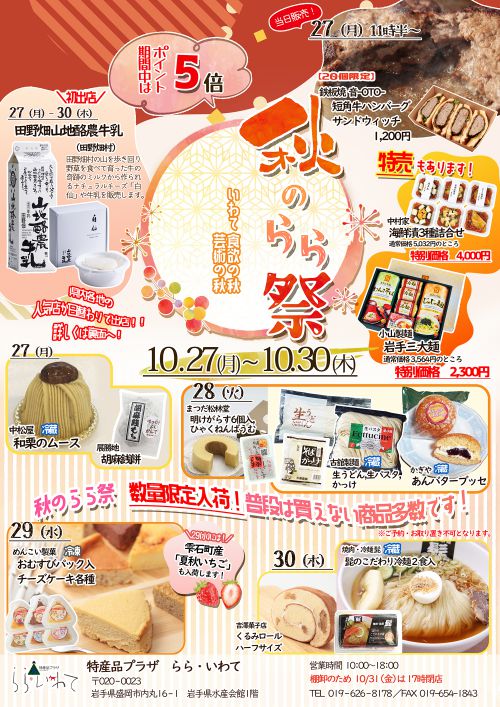 特産品プラザ「らら・いわて」にて、「秋のらら祭」が開催されます! 期間中は、普段買えない多数の商品が数量限定で入荷します! ぜひご... 続きを読む