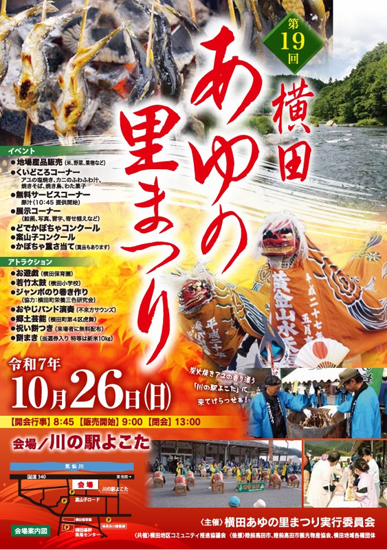 アユの塩焼きやカニのふわふわ汁、地場産品の販売に、豚汁のお振舞など、横田の秋のグルメをお楽しみください! 開催日 令和7年10月26... 続きを読む