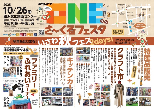 奥州市胆沢地域特産品をメインとした販売・体験ブースや、自慢の美味しさを携えてキッチンカーが集結する飲食ブース、奥州市内外のクラフト作家によ... 続きを読む