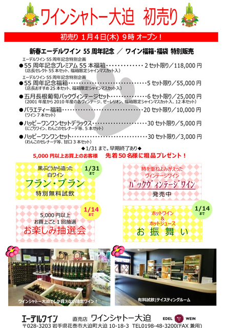 ワインシャトー大迫では、初売りを開催中です! 14日まではホットワイン&ホットジュースお振舞いやお楽しみ抽選会、31日まではワイン福箱... 続きを読む