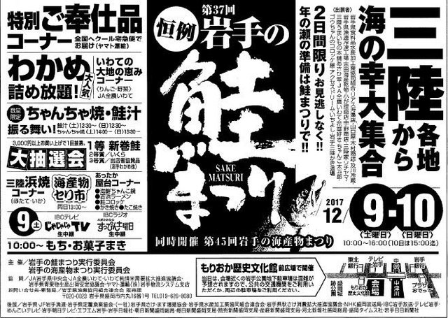 県内の沿岸各地の出展者が、新巻鮭・イクラなど鮭製品を中心に、岩手わかめ、ホタテ、あわび、うになどの三陸の海の幸を一挙に販売します! 大... 続きを読む