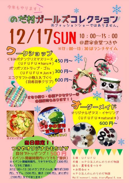 野田村のママさんたちのハンドメイド販売ブースに、かわいい小物作りを楽しめるワークショップもあります! ランチやカフェのほか、当日限定メ... 続きを読む