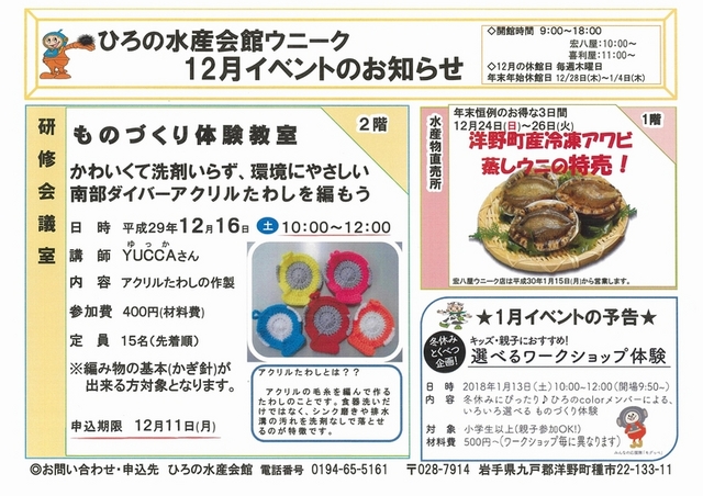 洋野町産冷凍アワビや蒸しウニの特売!年末恒例のお得な3日間です! 開催日 平成29年12月24日(日曜日)から26日(火曜日)まで ... 続きを読む