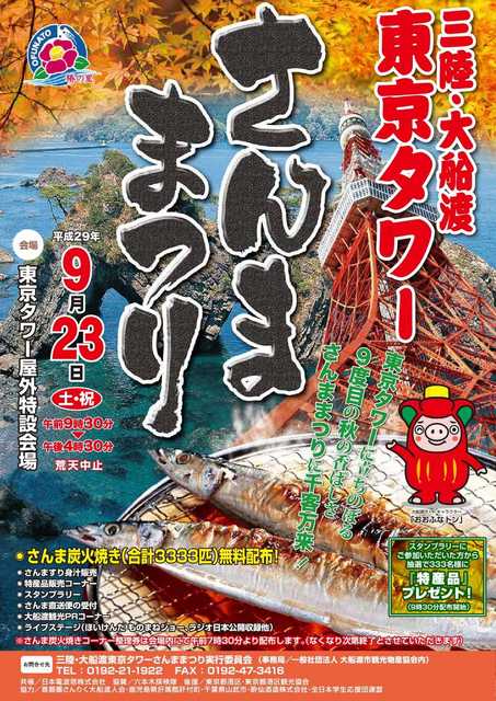 恒例の「第9回 三陸・大船渡 東京タワーさんままつり」が開催されます! 大船渡産の炭火焼さんま3,333匹が無料で振る舞われます。午前... 続きを読む