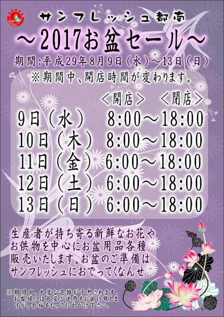 期間:平成29年8月9日(水)~13日(日) 内容:生産者が出荷するお花を中心にお盆用品やお供物、果物等販売致します。 期間中開... 続きを読む