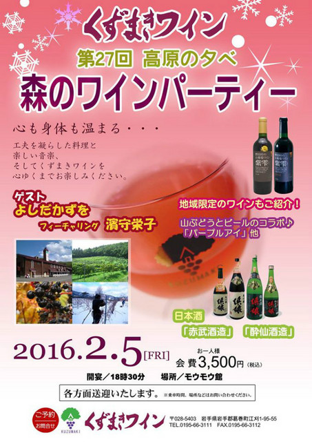 「くずまきワイン」と「美味しい食事」と「素敵な音楽」が楽しめるイベントが開催されます。 心も身体も温まって、ほっこりしてみてはいかがでしょ... 続きを読む