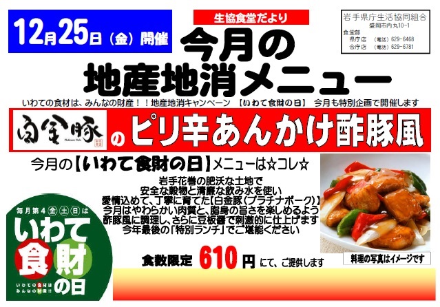 こんにちは♪ 毎月第4 金・土・日曜日の『いわて食財の日』に合わせ、県庁生協食堂において地産地消の特別メニューを提供しています。 ... 続きを読む