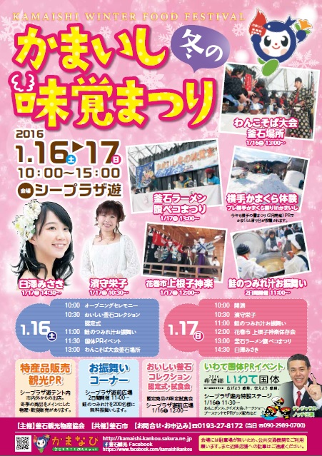 釜石市で冬の味覚まつりが開催されます。 ‘わんこそば大会釜石場所’‘釜石ラーメン腹ペコまつり’‘鮭のつみれ汁お振舞い’などおいしいものが楽... 続きを読む