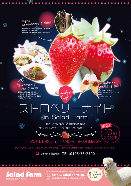 1/23(土)17:30~サラダファームでは「ストロベリーナイトin Salad Farm」を開催いたします。昼とは一味違う、大人が楽しめる... 続きを読む