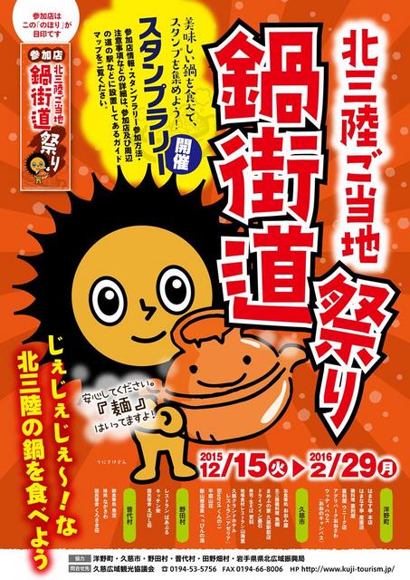 北三陸エリア(洋野町・久慈市・野田村・普代村・田野畑村)の22店舗で、‘地元の食材’と‘麺’を使用した鍋料理をテーマに、「北三陸ご当地鍋街道... 続きを読む