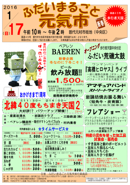 国道45号を歩行者天国にした「ふだいまるごと元気市」が開催されます! ‘もちまき天国’や‘岩誦坊焼(短角牛・炭育豚)お振る舞い’‘ベア... 続きを読む