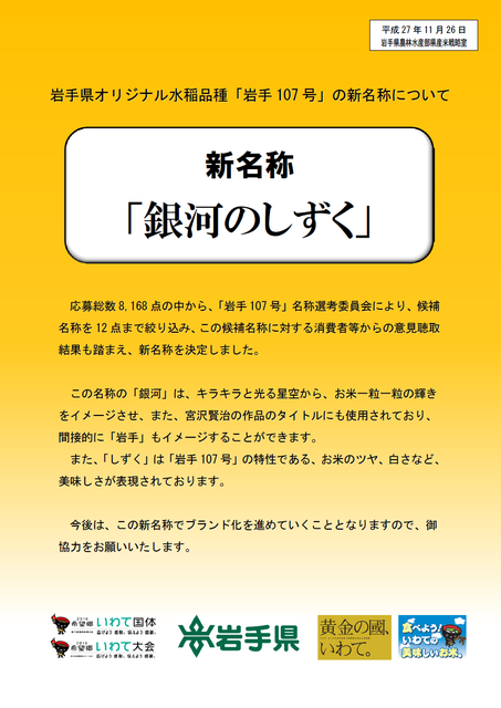 岩手県オリジナル水稲品種「岩手107号」の新名称が「銀河のしずく」に決定しました。 この名称の「銀河」は、キラキラと光る星空から、お米一粒... 続きを読む