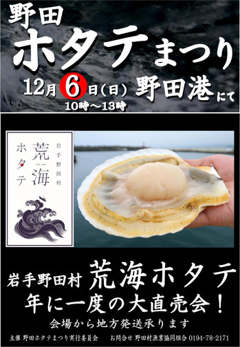 年に一度、ホタテの蓄養施設が一般公開されます! 野田産の‘荒海ホタテ’を生きたまま購入できるほか、焼きホタテや荒磯汁などさまざまに料理され... 続きを読む