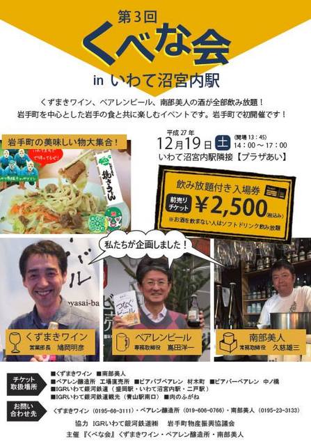 ‘くずまきワイン’‘ベアレンビール’‘南部美人’の頭文字をとった「くべな会」のご案内です。 「く・べ・な」のお酒が全部飲み放題! 岩手町... 続きを読む
