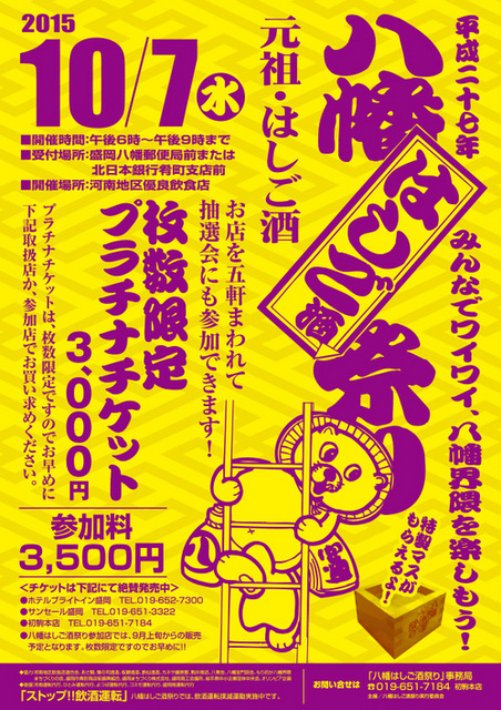 盛岡河南地区界隈加盟店のうちお好きな5店を選んで廻るスタンプラリー‘八幡はしご酒祭り’が開催されます! 参加者には、‘特製マス’のプレゼン... 続きを読む