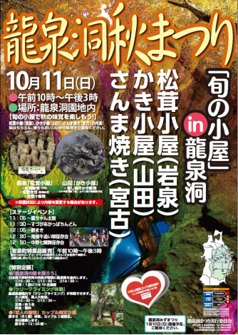龍泉洞で恒例の秋まつりが開催されます。 岩泉の‘松茸小屋’、山田の‘かき小屋’、宮古の秋刀魚が一堂に会します! その他にも岩泉町の特産品... 続きを読む