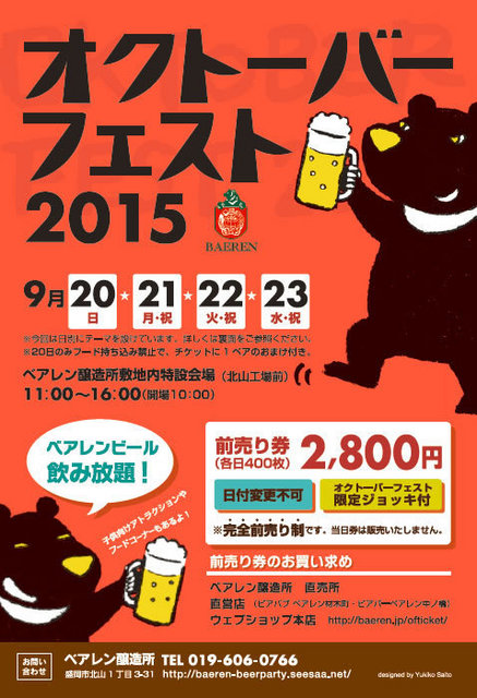 ベアレン醸造所で、恒例のビール祭りが開催されます! 前売りチケット好評発売中です! ◆日時:平成27年9月20日(日)~23日(... 続きを読む