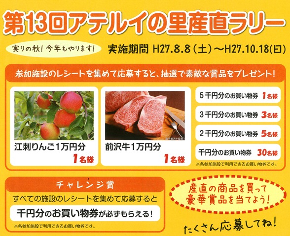胆江地方産直施設連絡会では、下記の日程で「第13回アテルイの里産直ラリー」を開催しています。 参加施設のレシートを集めて応募すると、抽... 続きを読む