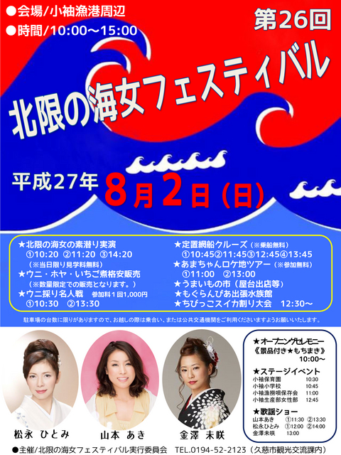 久慈市小袖漁港を会場に、北限の海女の素潜り実演、ウニ・ホヤの格安販売など、海の恵みを堪能できるイベントが開催されます! 豪華な歌謡ステージ... 続きを読む