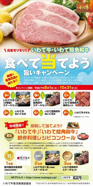 いわて牛普及推進協議会では、8月1日から10月31日まで、県内主要スーパー・精肉店で「いわて牛・いわて短角和牛食べて当てよう旨いキャンペーン... 続きを読む