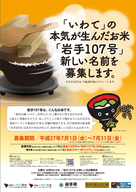 岩手県では、来年秋にデビューする新品種米「岩手107号」の名称を募集しています。 「岩手107号」は、あっさりとした粘りと噛むほどに広がる... 続きを読む