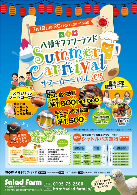 7/19、20の2日間、八幡平フラワーランドでは 「サマーカーニバル2015」を開催いたします。 BBQの食べ放題&ビールの飲み放題... 続きを読む