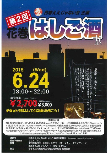 花巻市双葉町近辺の参加店舗で「第2回花巻はしご酒」が開催されます。 チケットを購入し、約40店舗からお好きなお店4店舗を選んでお酒を楽しむ... 続きを読む
