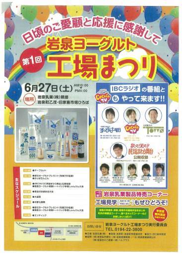 ‘岩泉ヨーグルト’でおなじみの岩泉乳業の工場まつりが開催されます! 岩泉乳業製品の特売や、岩泉町の特産品販売、工場見学(10:30~14:... 続きを読む