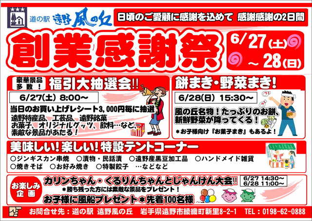 「道の駅遠野風の丘」では、日頃のご愛顧に感謝の気持ちを込めて「創業感謝祭」が開催されます。 ‘美味しい、楽しい、特設テントコーナー’や... 続きを読む