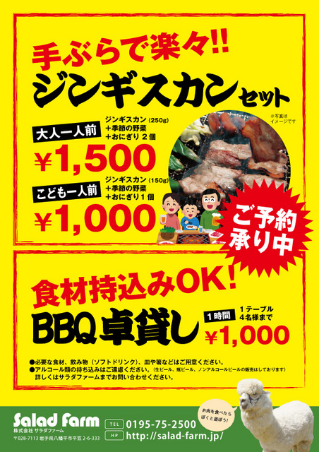 サラダファームでは只今、ジンギスカンバーベキュープランが大人気です。ジンギスカン250gに季節の野菜、おにぎり2個が付いてる大人一人前セット... 続きを読む