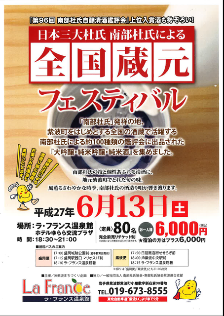 日本三大杜氏南部杜氏による「全国蔵元フェスティバル」が開催されます。 鑑評会に出品された、約100種類の『大吟醸・純米吟醸・純米酒』が集ま... 続きを読む