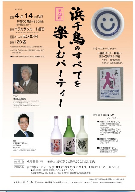 今年も釜石で「第26回浜千鳥のすべてを楽しむパーティー」が開催されます! 第1部は、NPO吟醸酒研究機構代表・篠田次郎氏とIBC岩手放... 続きを読む