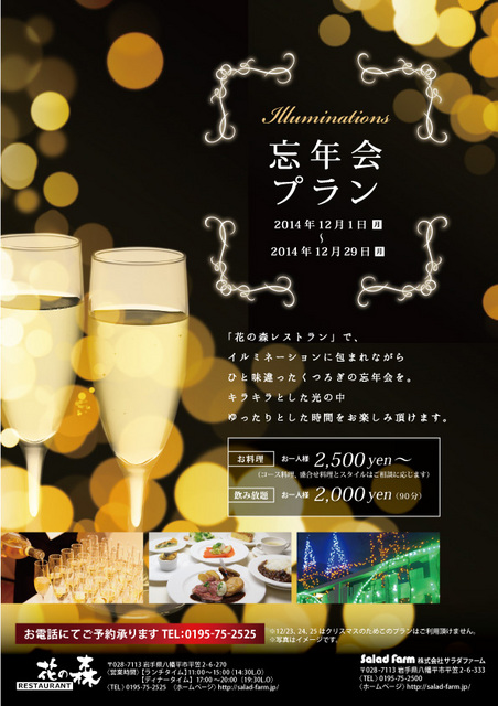 花の森レストランでは忘年会プランのご予約を承っております。素敵なイルミネーションを見ながら、大切な方々との一年を振り返るくつろぎの忘年会を開... 続きを読む