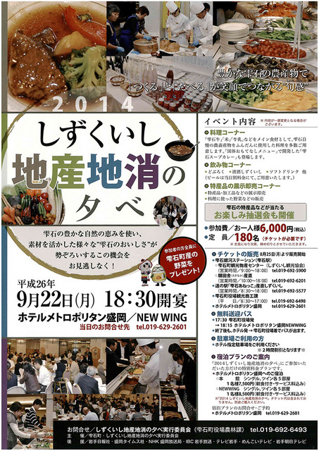 毎年大盛況の「しずくいし地産地消の夕べ」のご案内です! 開催期間:平成26年9月22日(月) 時間:18:30開宴 場所:... 続きを読む