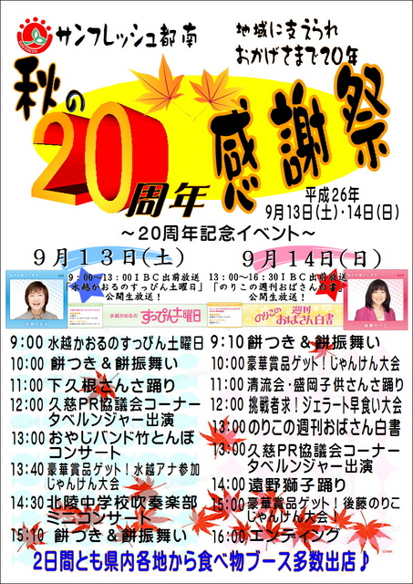 サンフレッシュ都南 ~地域に支えられおかげさまで20周年~ 『秋の20周年感謝祭開催!』 日時:平成26年9月13日(土)~14日... 続きを読む