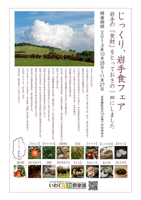 首都圏10店舗の飲食店で、岩手県産食材を使用した特別メニューを提供する「じっくり、岩手食フェア」を10月28日から1ヶ月間開催します。 こ... 続きを読む