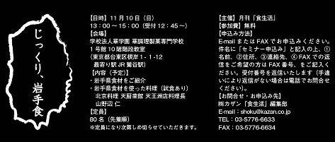 月刊「食生活」主催の岩手食材セミナーが開催されます。 現在掲載中(11月号~)の特別連載企画“じっくり岩手食”で取材に同行したシェフが岩手... 続きを読む