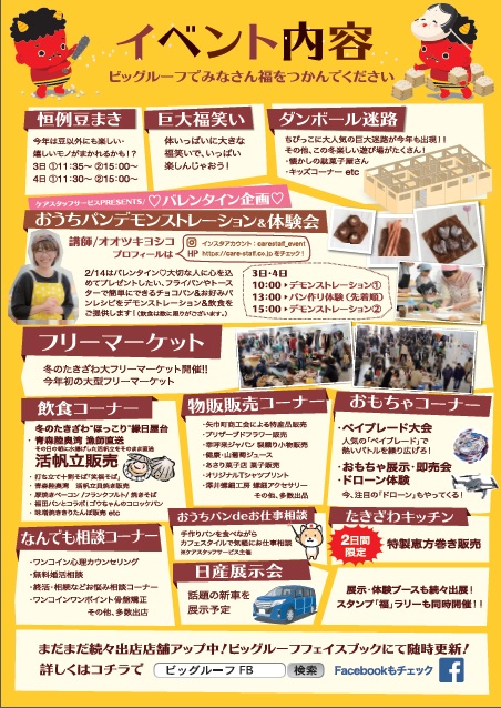 たきざわキッチンでは、節分イベントならでは「特製恵方巻き」が二日間限定で販売されます!飲食・物販コーナーは多数出店予定となっているほか、パン作り体験やフリーマーケット、ダンボール迷路など、楽しいイベントが盛り沢山です!