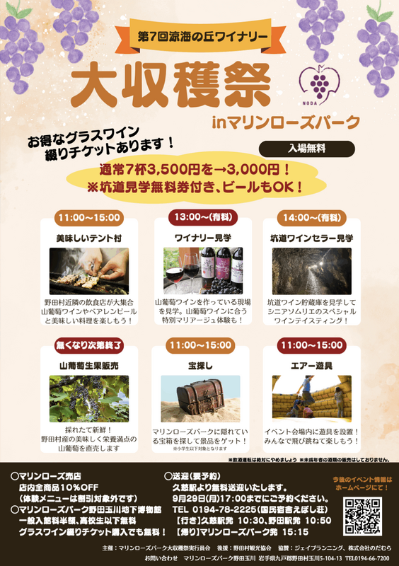 【野田村】「第7回涼海の丘ワイナリー大収穫祭inマリンローズパーク」開催!(10月5日)