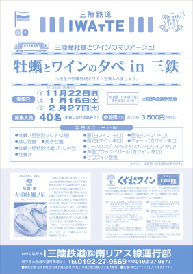 三陸産牡蠣の‘牡蠣づくし御料理’と‘くずまきワイン’を三陸鉄道の列車内で楽しむことができるイベントのご案内です。