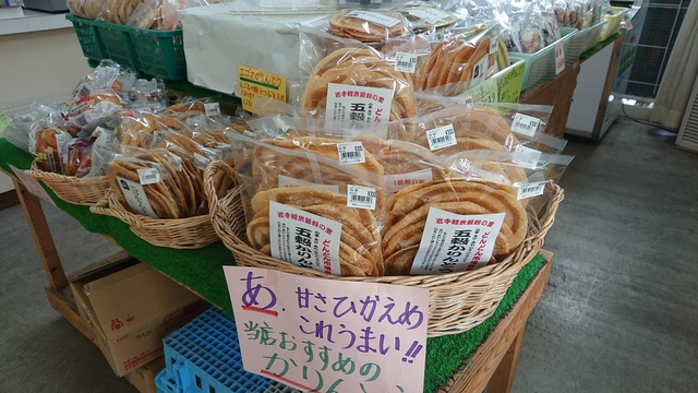 八戸自動車道「軽米IC」を下りて信号を左折すること約5分ほどのところに位置する産直です。初夏はさくらんぼやブルーベリー、夏は桃やぶどう、秋はりんご各種など果物が豊富です。目玉商品の「五穀かりんとう」は大きくて平べったい雑穀入りのうずまきかりんとうです。また、小麦粉で作る郷土料理「生(なま)麩(ふ)」のしょうゆ漬けやからし漬けも人気です。週末は炭火で焼く串もちや豆腐田楽も食べられます。